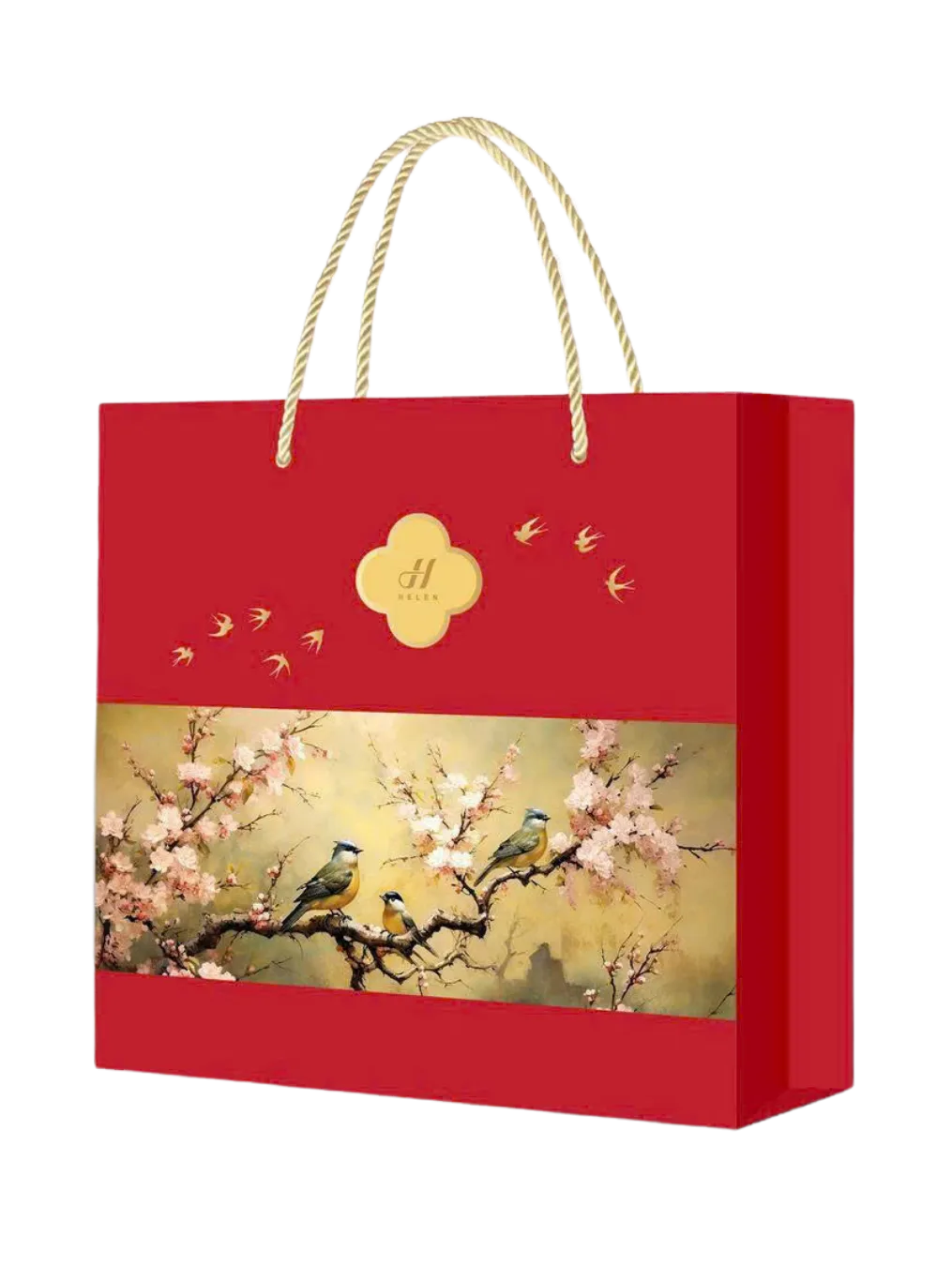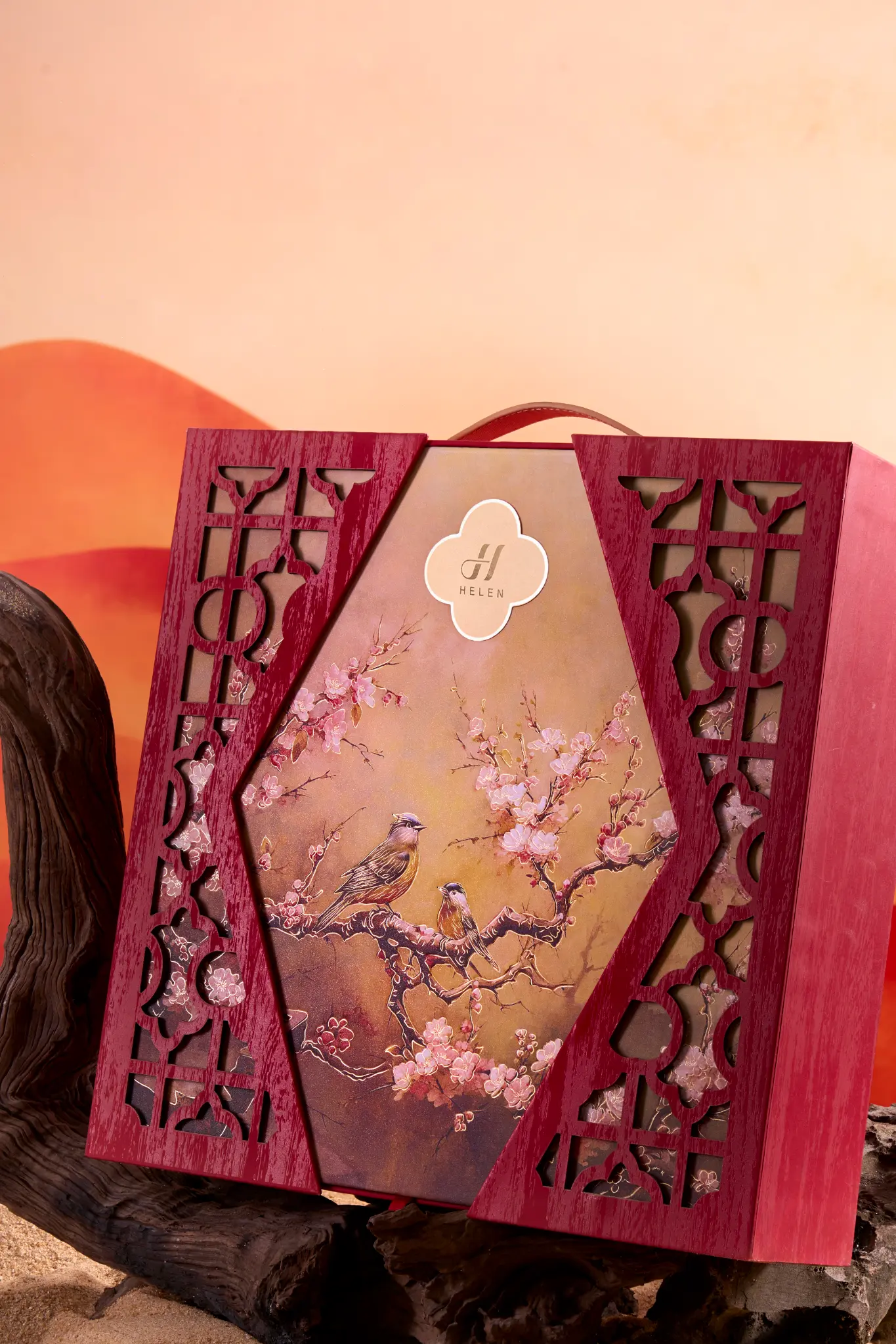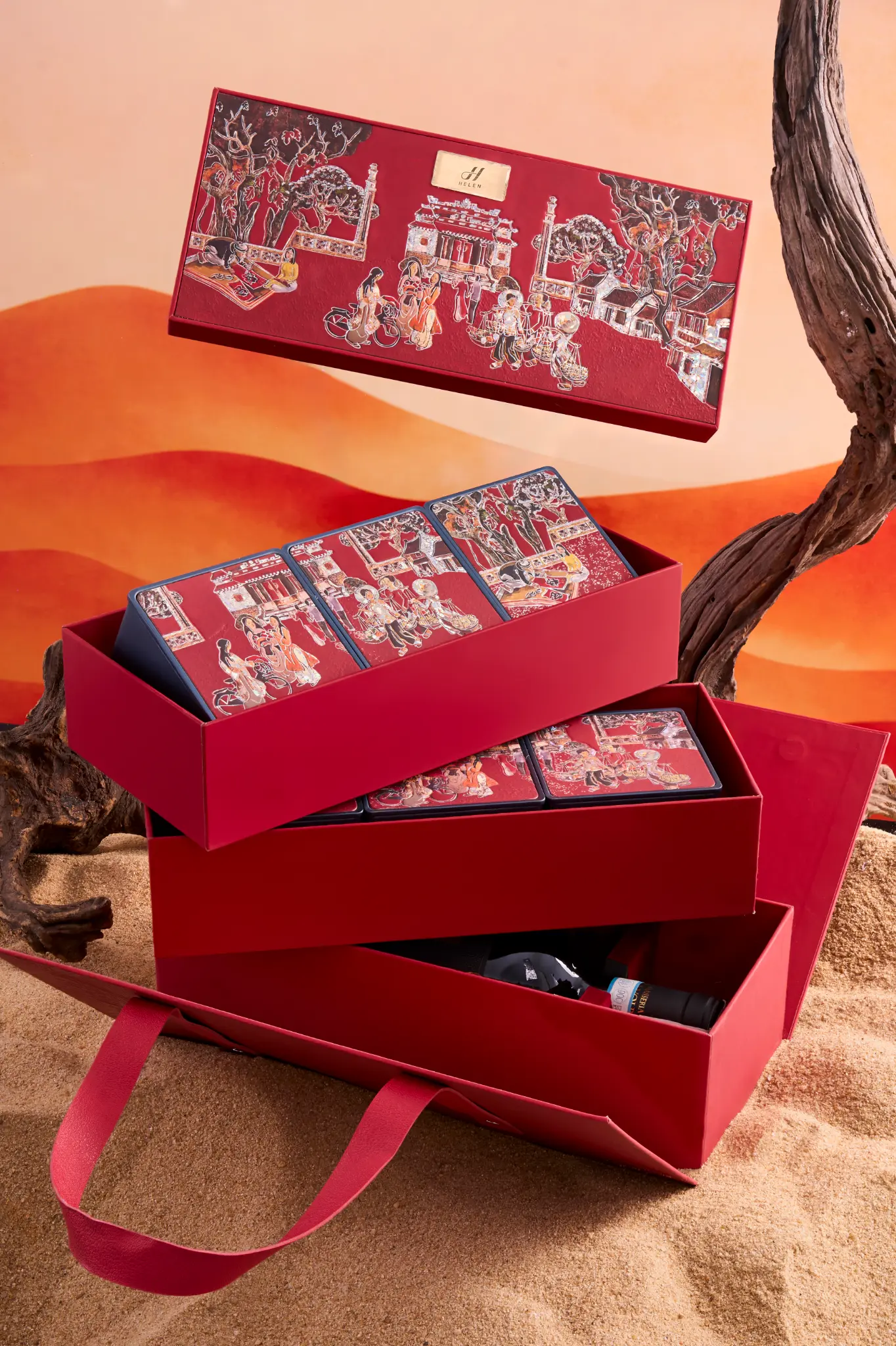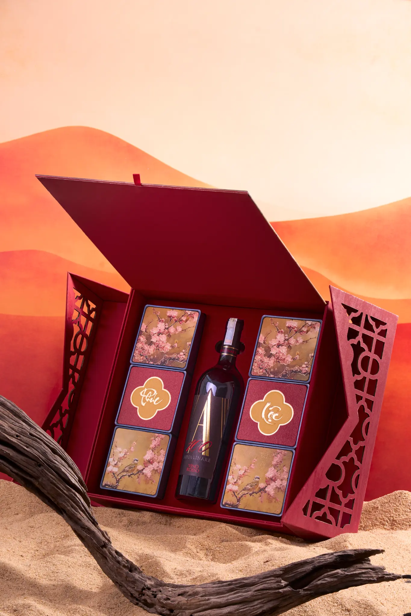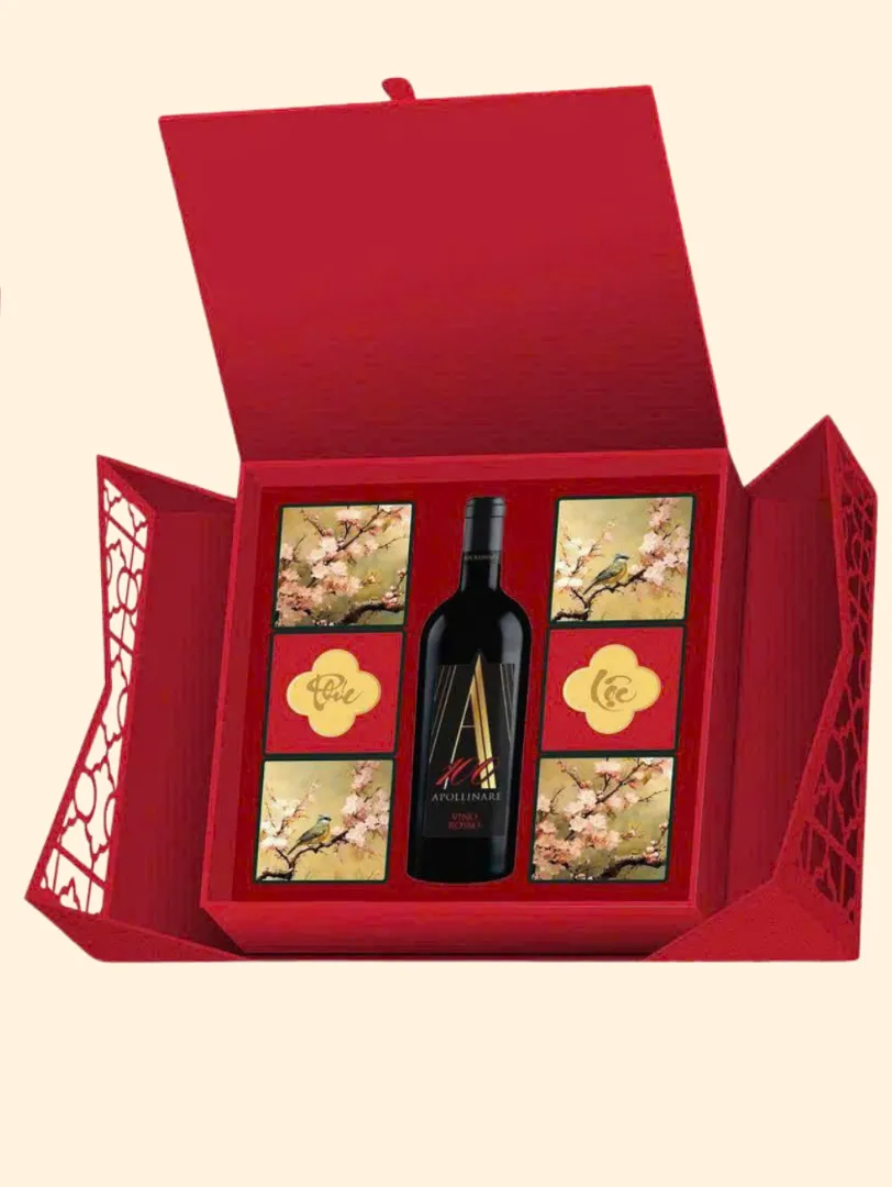 Chiếc hộp là một Kiệt tác nghệ thuật với sắc Đỏ Hoàng Gia lộng lẫy, kết hợp cùng họa tiết Chim én báo xuân và Cành đào nở rộ được chạm khắc tinh xảo. Đây không chỉ là một món quà biếu, mà là một lời chúc Kinh doanh Phát đạt, Tài lộc Vĩnh Cửu, một năm mới sung túc vượt bậc, xứng tầm với vị thế đỉnh cao của người nhận.